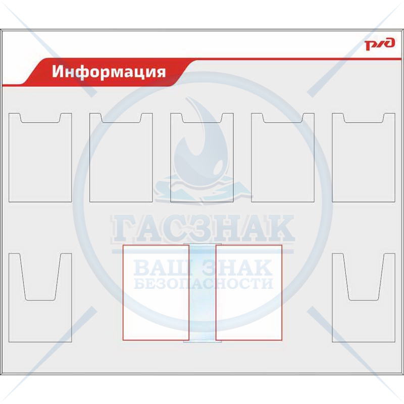 Стент РЖД Уголок охраны труда Пластик ПВХ 4 мм 900х900 (профиль алюминевый, 3 объемных кармана А4, 3 плоских кармана А4) (900х900; Пластик ПВХ 4 мм , пленка самоклеющаяся, алюминиевый профиль; Алюминиевый профиль)