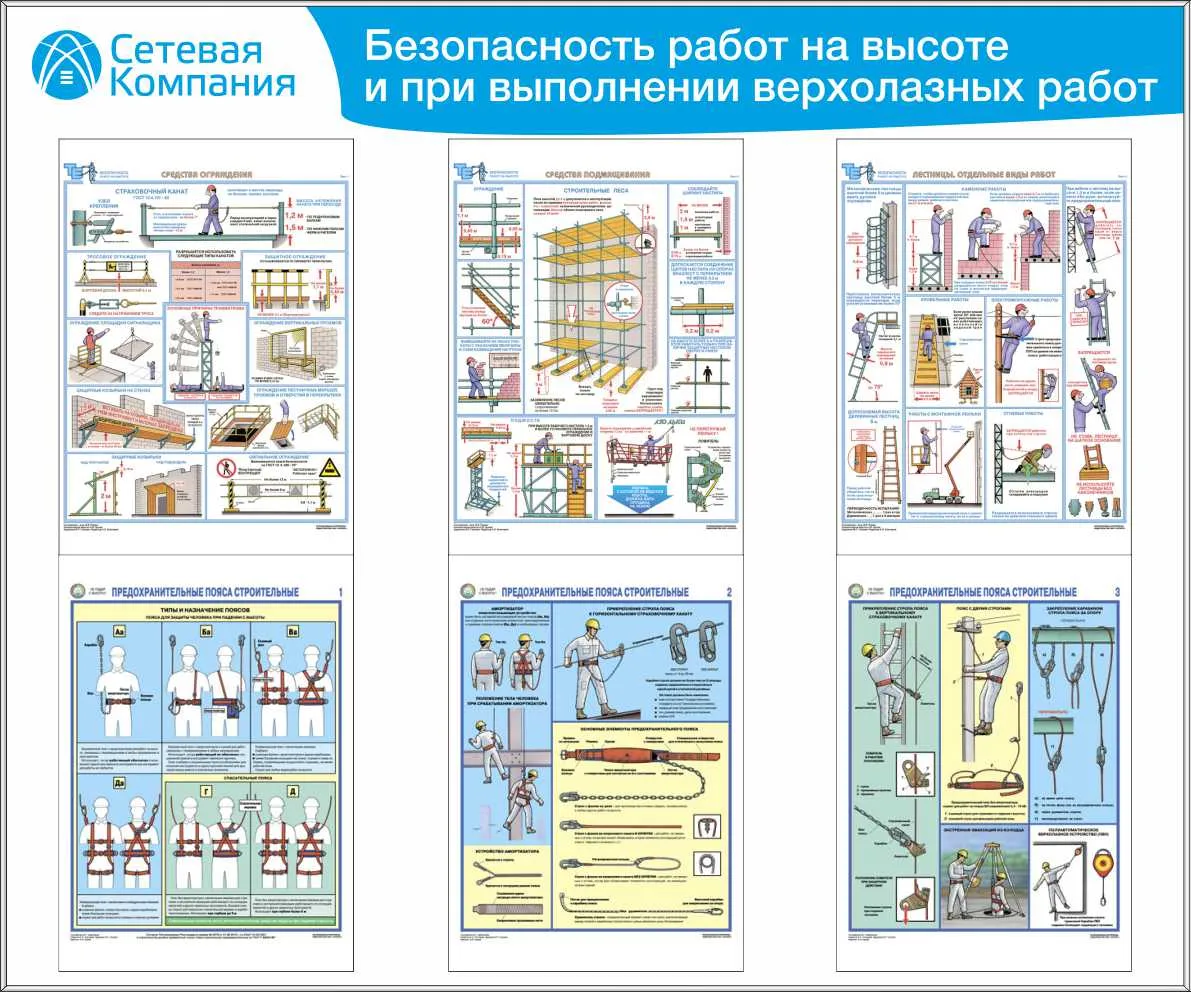 Стенд для ОТ безопасность работ на высоте и при выполнении верхолазных работ, 6 плак. А3 (1 200х1 000; Пластик ПВХ 4 мм, Алюминиевый профиль)