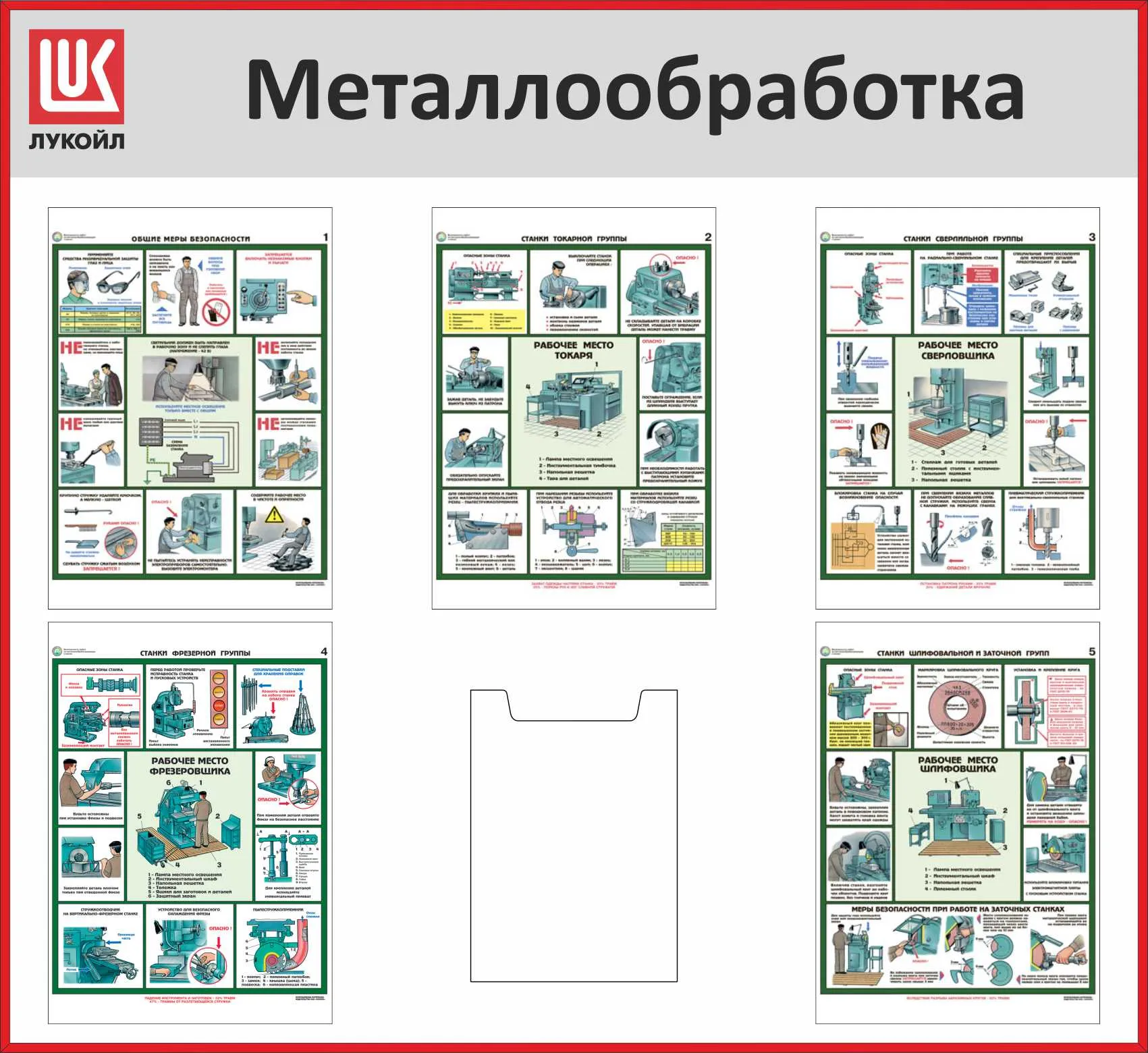 Стенд Безопасность труда при металлообработке, 5 плакатов соуэло А3, объемный карман А4 (1100х1200; Пластик ПВХ 4 мм; Алюминиевый профиль)