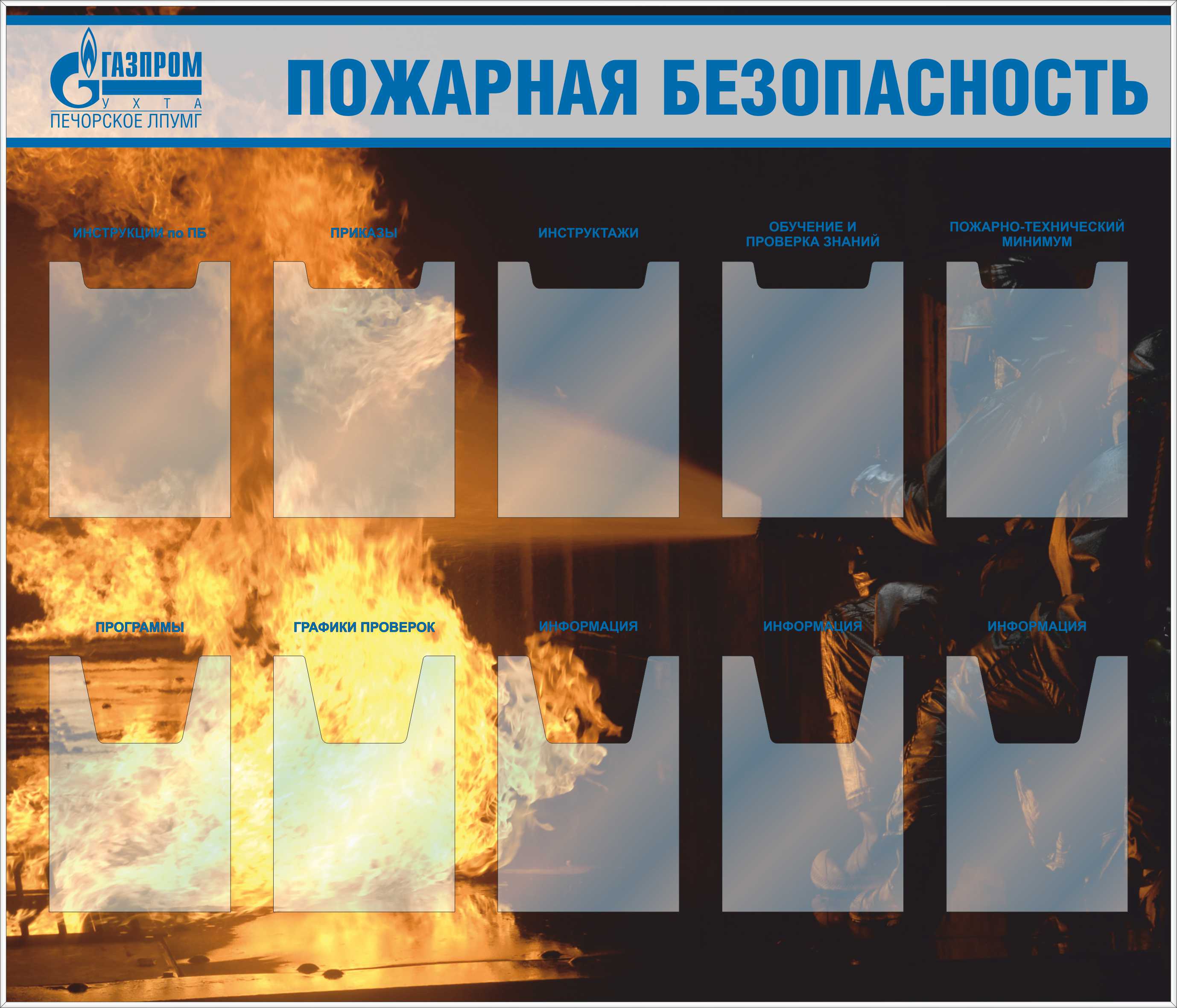 Стенд Умей действовать при пожаре. 9 плакатов А3, Логотип (1400х1200; Пластик ПВХ 4 мм, пластиковый профиль; Пластиковый)
