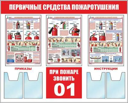 Стенды по охране труда Первичные средства пожаротушения, 3 плаката, 4 кармана А4 (Пластик ПВХ 4 мм, пластиковый профиль; 1500х1200)